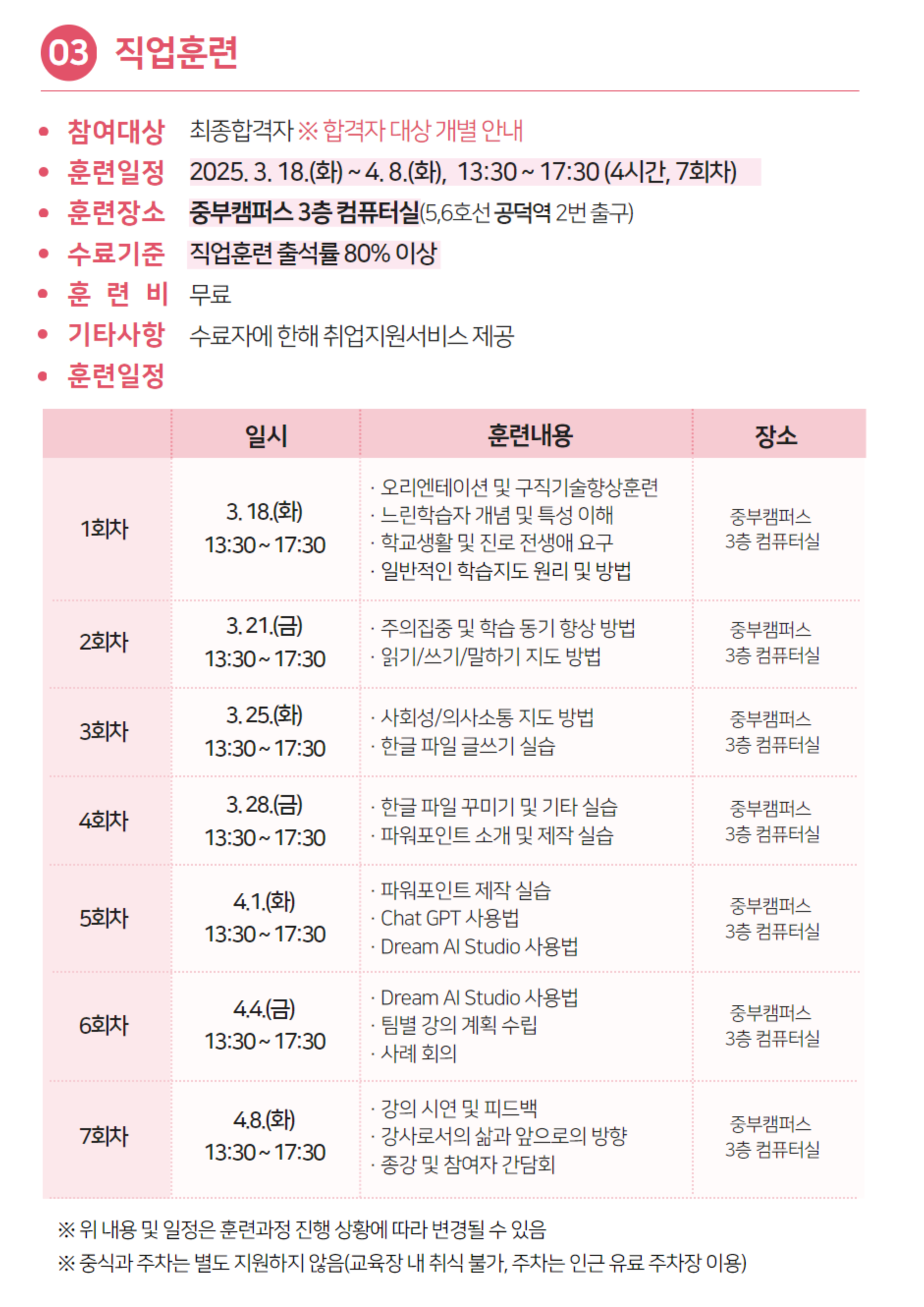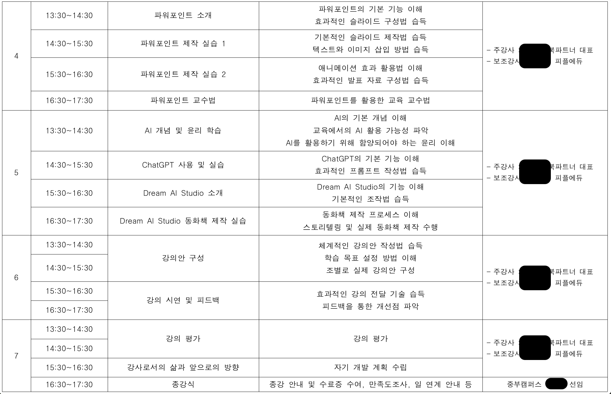 4시간씩 7번, 28시간동안 피플에듀 교육프로그램에 필요한 기술(스킬)교육 (한글, PPT, AI, Dream AI Studio) 과 느린학습자아동의 이해 및 교수법을 익히는 강사 양성과정을 시작했습니다.
