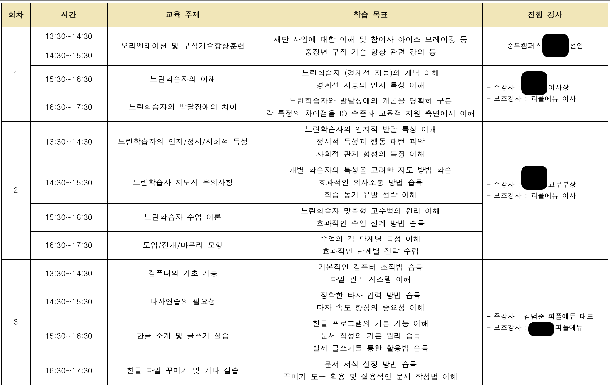 기술(스킬) 교육은 피플에듀가, 느린학습자아동의 이해 및 교수법은 느린학습자아동을 위한 국내최고의 대안학교중 한 곳인, 예하예술학교 교무부장님, 그리고 느린학습자시민회에서 맡아 진행해주셨습니다.