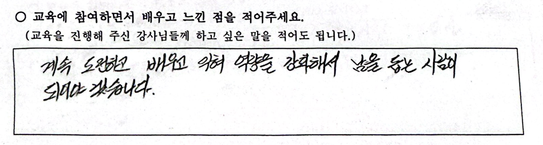 4050분들의 니즈와 열정, 그리고 느린학습자아동에게 일상생활에 적응해 살아가기 위한 AI디지털 교육이 필요하다는 것, 그리고 최고의 양성과정을 하기 위해서는 어떤 요소들이 갖춰져야하는지 느끼고 깨달을 수 있었습니다.