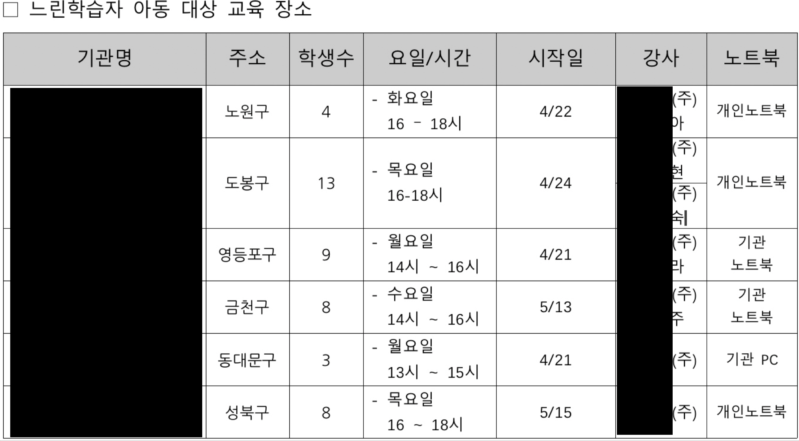 ( 연락주셨지만, 도움드리지 못한 기관분들께 죄송합니다!ㅜㅜ 더욱 성장해서 느린학습자아동의 IT교육을 전담하는 단체가 될 수 있도록 더 노력하겠습니다! ) |