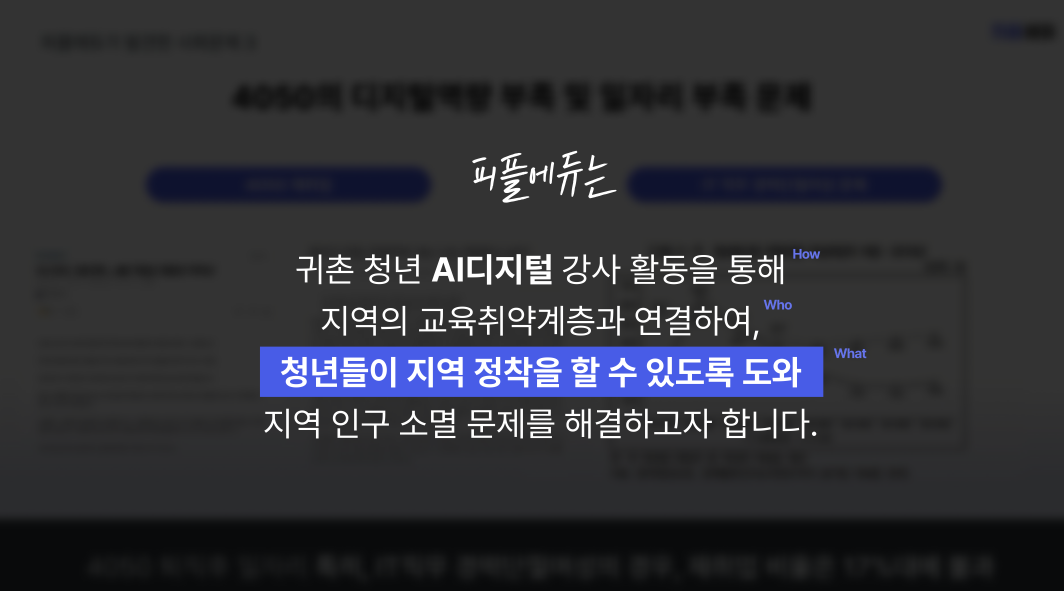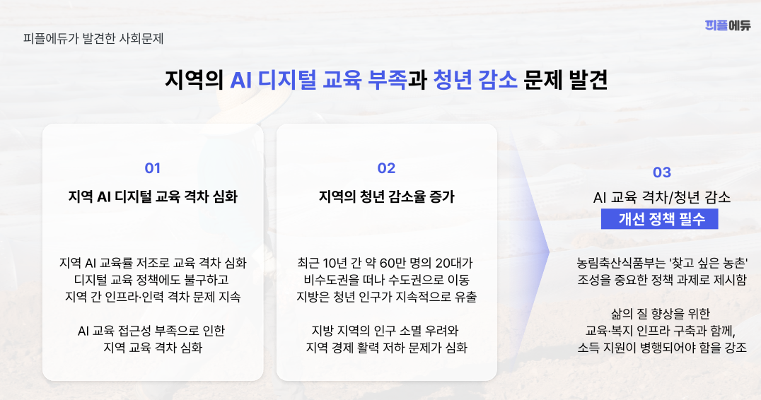 최근 피플에듀는 좋은 기회로 지역문제해결을 위한 프로젝트를 준비하게 되었습니다. 피플에듀의 미션이 "모두의 AI교육기회를 통해 교육불평등을 해소한다" 였었기 때문에,