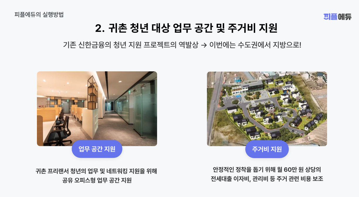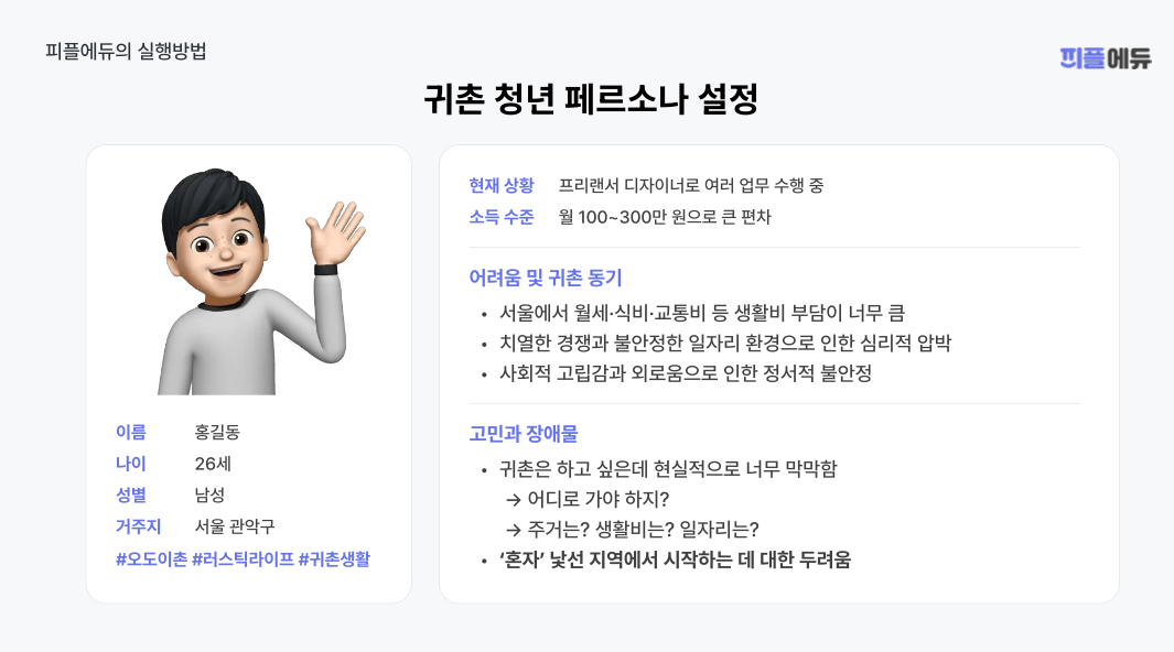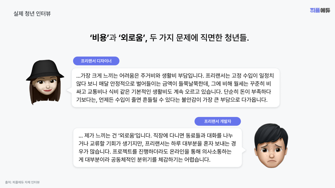 인터뷰한 결과, "비용"과 "외로움" 그리고 "막막함"이 공통된 키워드로 발견되었는데요, 그래서, 일정 소득이 있는 프리랜서 청년을 지방에서 거주할 수 있도록 주거와 업무공간을 지원하며 돕고 추가적인 소득을 얻게 함으로써 정착까지 잇는 프로젝트를 기획하게 되었습니다.