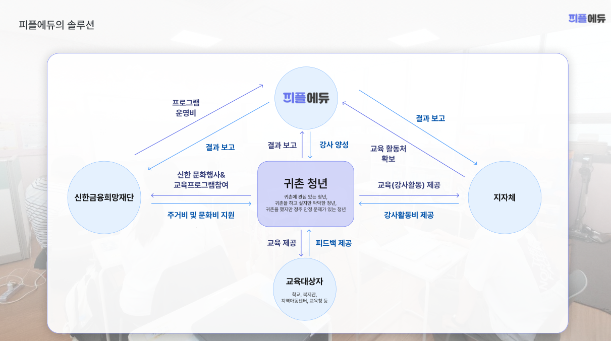 해당 프로젝트를 기획하면서 지역의 문제가 어떠한지 그리고 청년들의 생각은 어떠한지 많이 들어볼 수 있어서 감사했고, 피플에듀가 교육문제 뿐만 아니라, 동시에 다양한 문제를 해결해나갈 수도 있겠구나! 를 배울 수 있었던 시간이었습니다.
