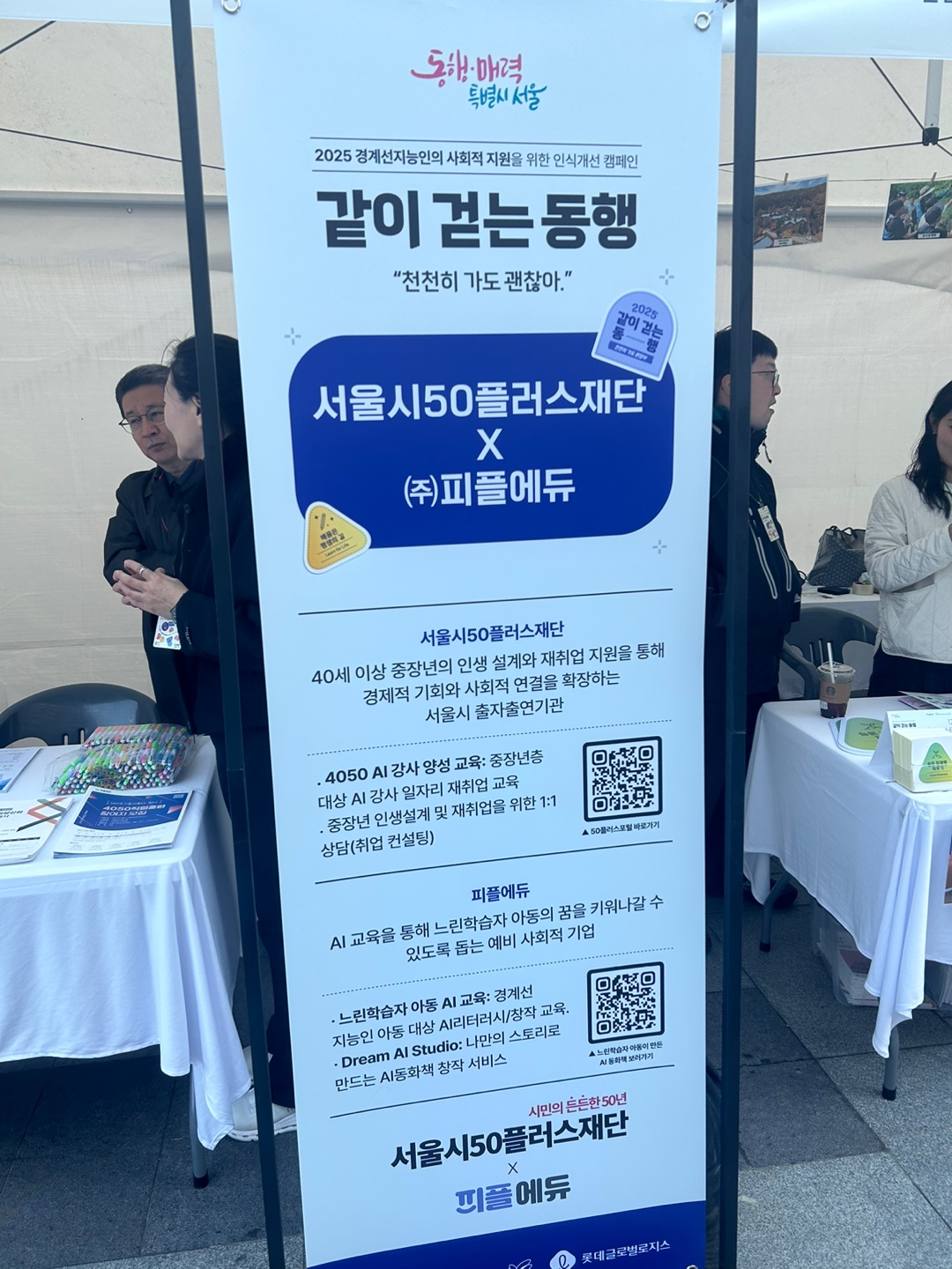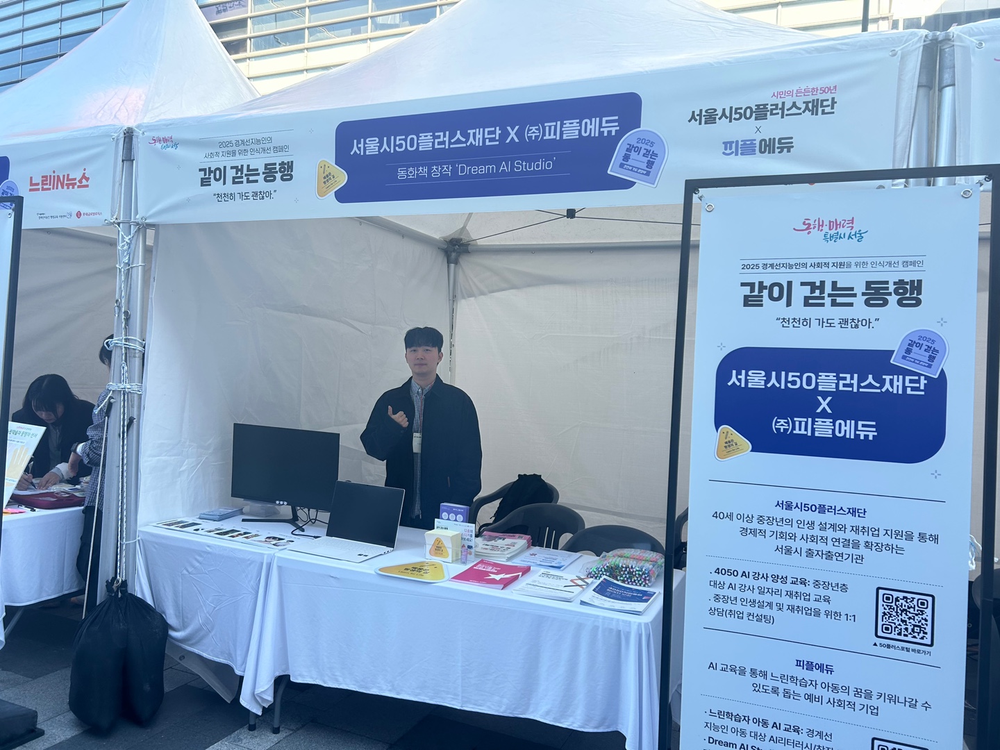 이번주에 참여한 건, 바로 10월 22일 서울 청계광장에서 열린 '같이 걷는 동행(천천히 가도 괜찮아)' 인식개선 캠페인이었는데요, 느린학습자(경계선지능인)에 대한 사회적 인식을 개선하고자 마련된 정말 뜻깊은 자리였습니다! 이러한 행사에 부스를 운영하면서 많은 것을 느낄 수 있었습니다.