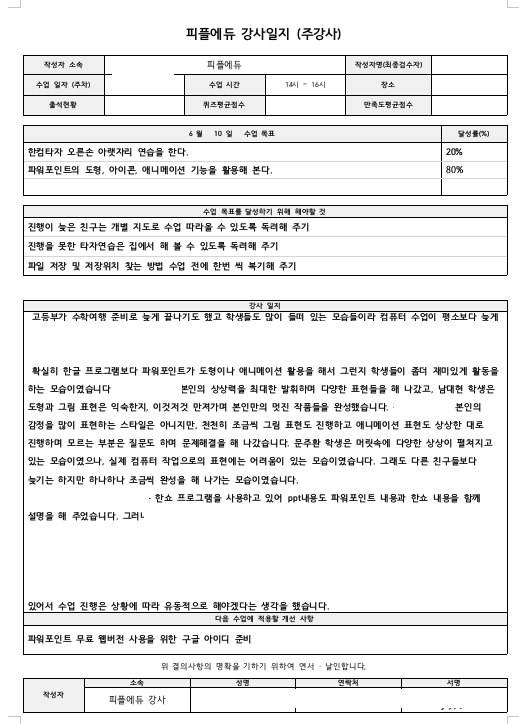 아이들의 변화와 성장을 만드는 것이 저희 단체의 가장 큰 목적이자 존재의 의의이기에 교육후에 강사가 2가지 서류 와 3가지 자료를 제출합니다.