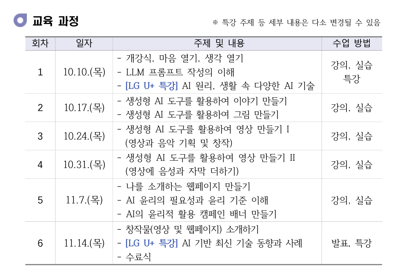 또 단순히 AI활용만을 가르치는 것이 아닌, 올바른 AI활용법에 대한 강의를 제공해 AI윤리의 필요성과 AI윤리에 대해 생각해보는 시간도 갖습니다.