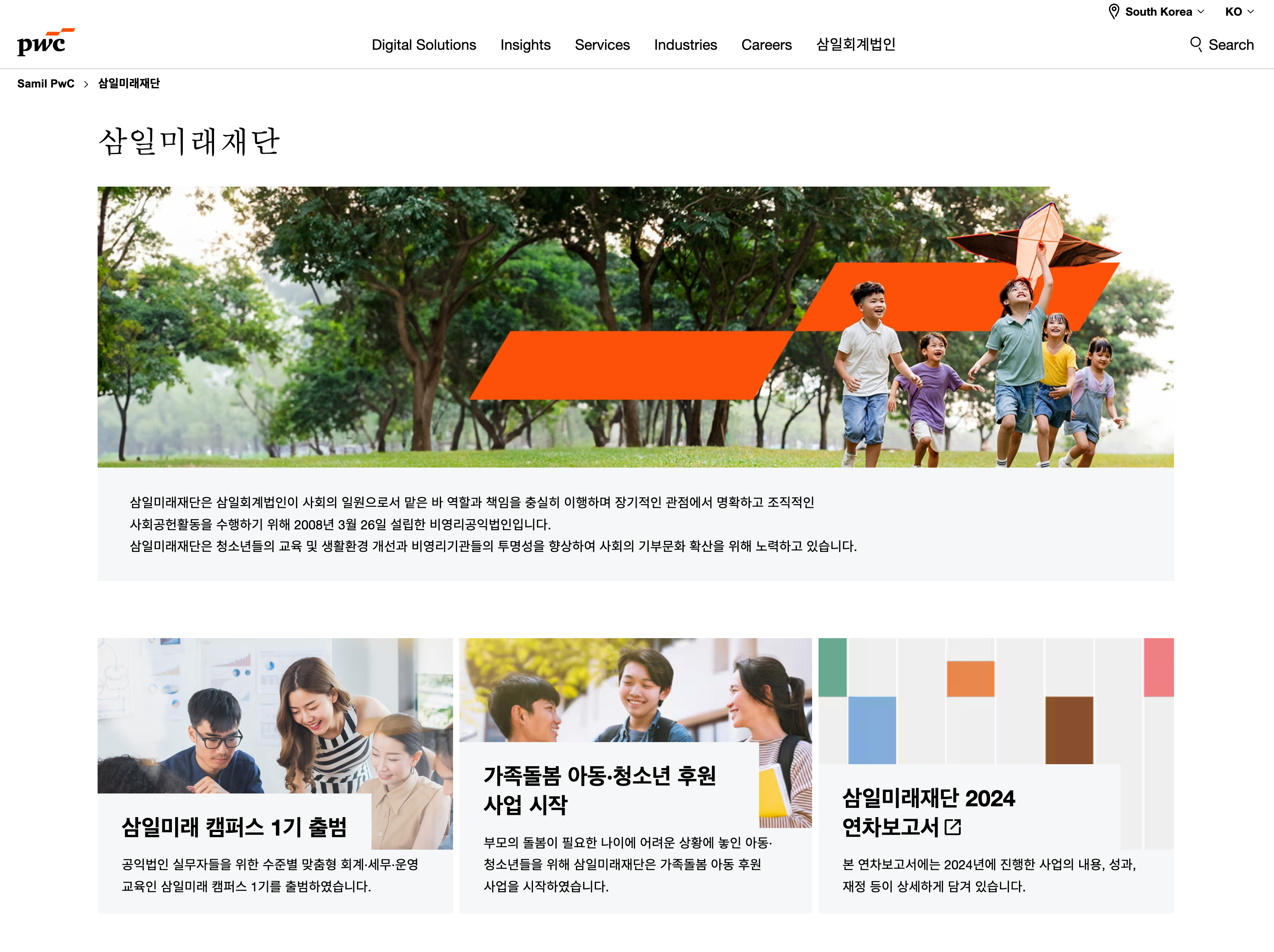 삼일미래재단은 삼일회계법인, PwC컨설팅의 조직과 임직원들이 사회와 건강한 관계를 맺어가는데 필요한 지속가능한 통로가 되는 재단으로, 1) 아동청소년 교육지원사업 2) 아동청소년 관련 지원사업 3) 위기환경 아동 청소년 지원사업 4) 아동청소년 환아지원사업 5) 비영리법인 투명성 개선사업 6) 임직원 봉사활동 지원 사업 등 삼일회계법인의 전문성을 바탕으로 지속가능한 사회적가치를 만들어가고 있는 재단입니다.