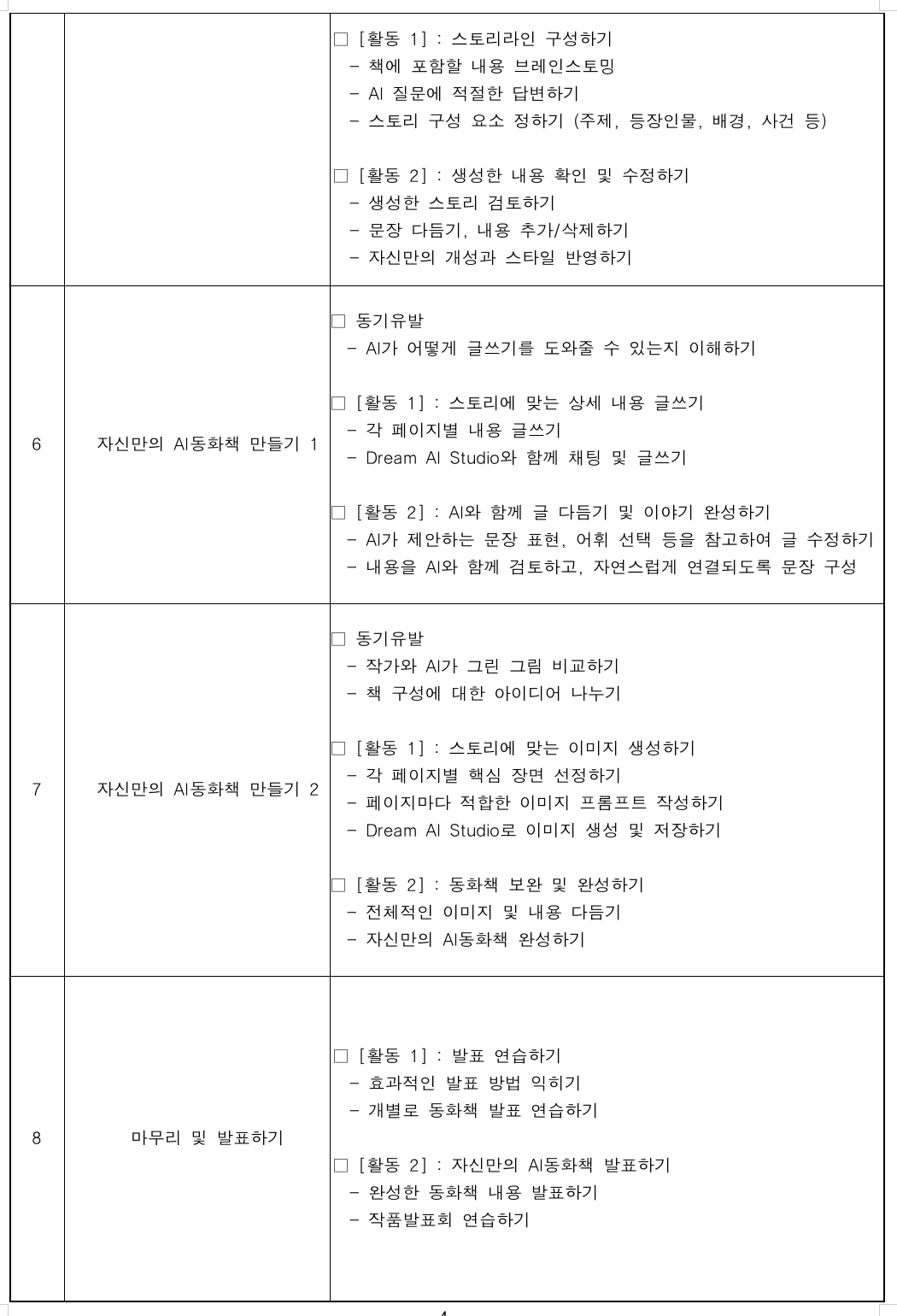 그래서 위와 같은 프로젝트 계획이 수립될 수 있었습니다! 서울삼광초등학교, 서울이태원초등학교 2곳에서 각각 8회기 동안 AI를 활용해 자신만의 그림책을 만드는 교육을 진행하게 되었습니다.