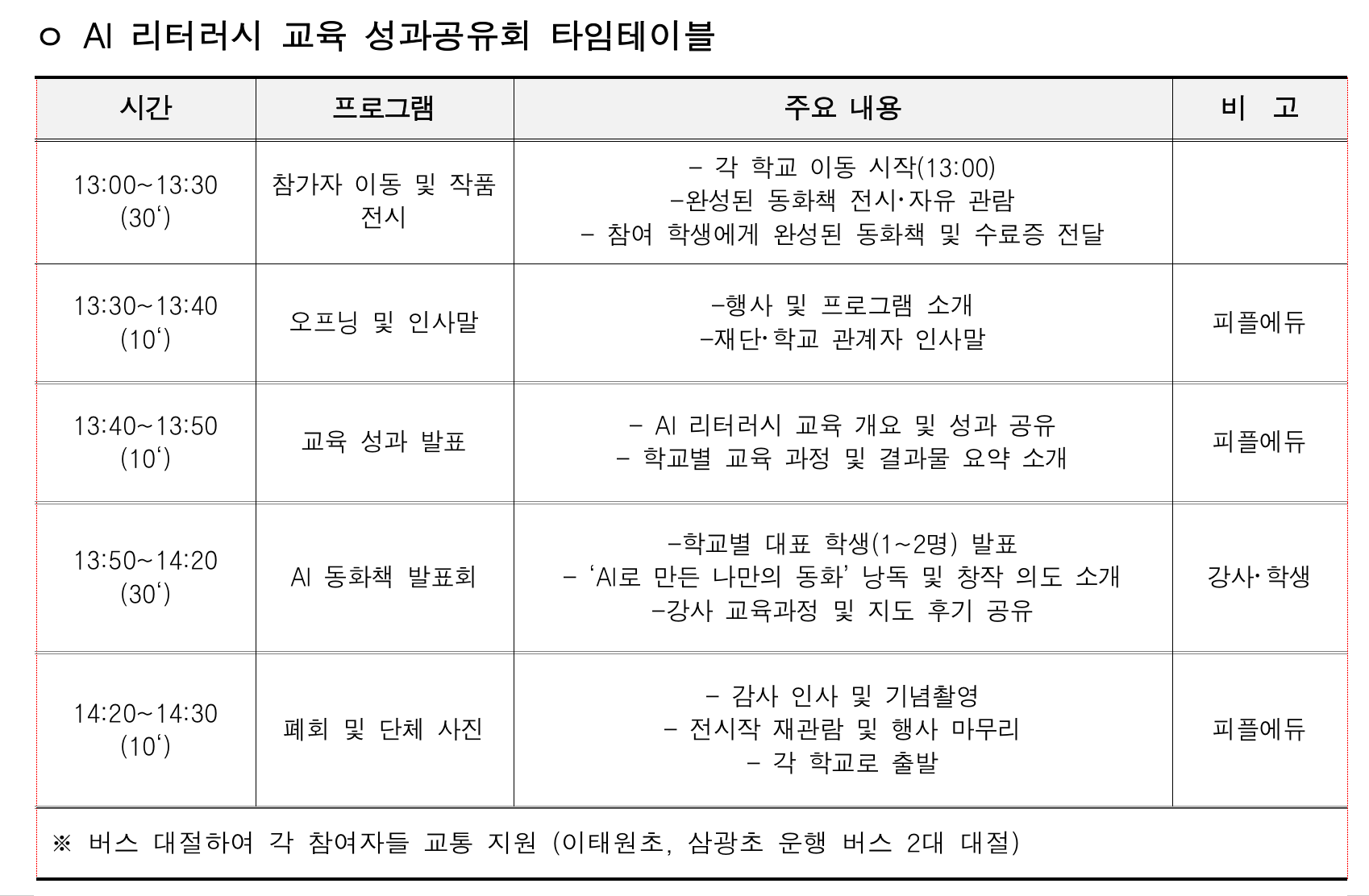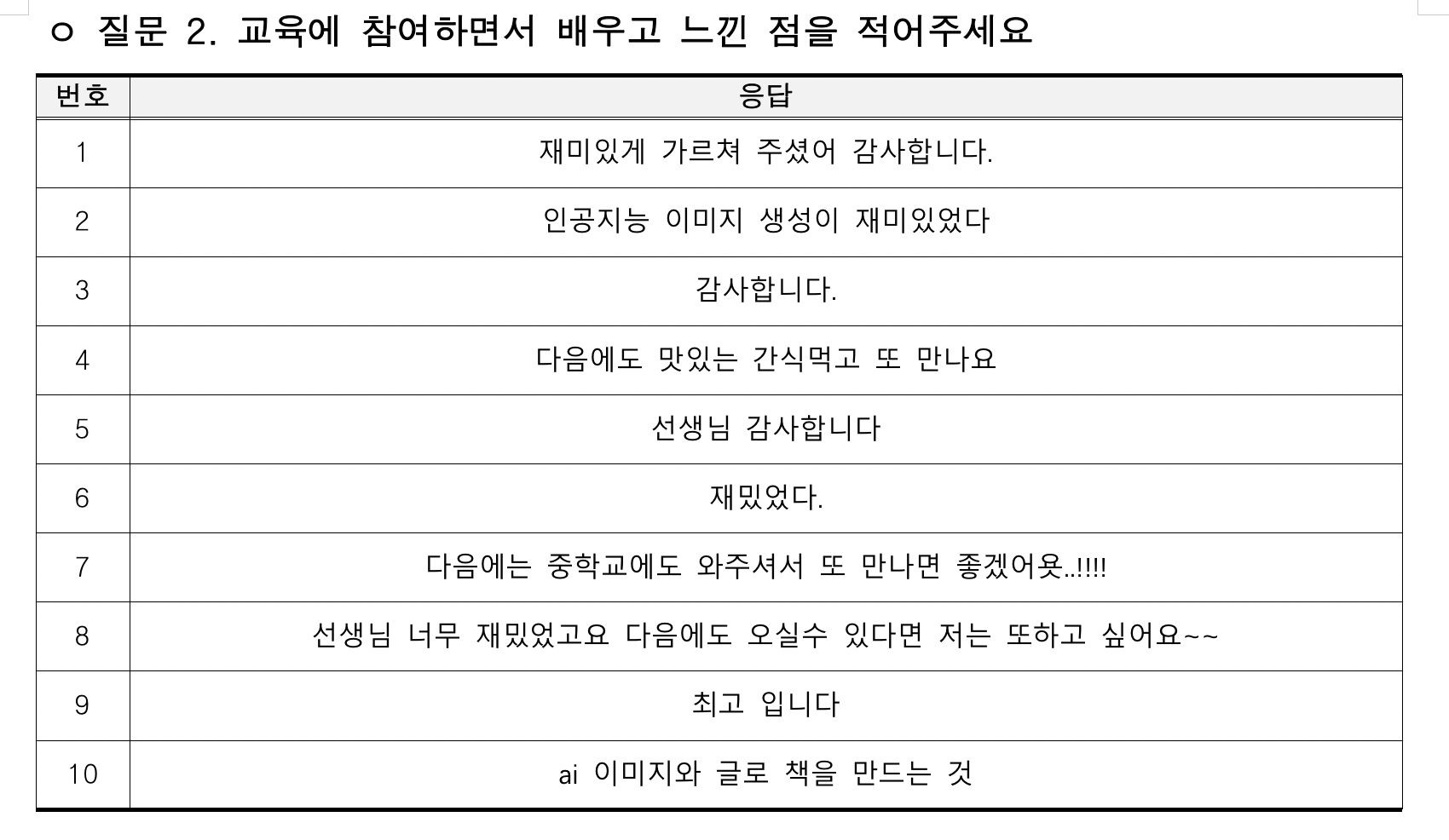 피플에듀의 혼을 갈아 넣은 교육이었고, 그에 따라 모두가 만족하는 교육을 만들어낼 수 있었습니다. 특히 단순히 한글이나, AI역량이 높아진 것뿐만 아니라, 정서적으로 아이들이 자신감을 얻었다는 평이 많았어서, 더욱이 감사했습니다. (특정 대상을 대상으로 교육을 진행할 때에는 이런부분을 더욱 세심하게 챙기고 있습니다 )